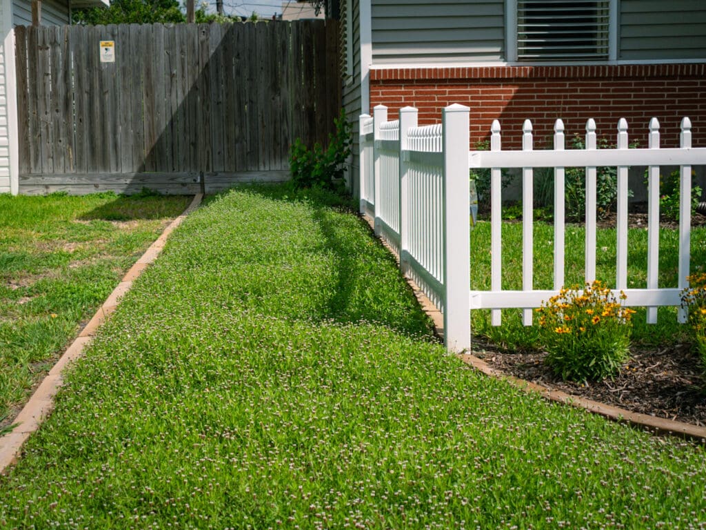 This is also a great time to think about whether you need or want all of your lawn space. Consider reducing lawn space by increasing your planting bed space, adding new planting areas, using native groundcover like frog fruit to replace lawn areas (pictured), or creating space for wildflower seeding – lots of other options that are more beautiful and more beneficial than a traditional lawn.